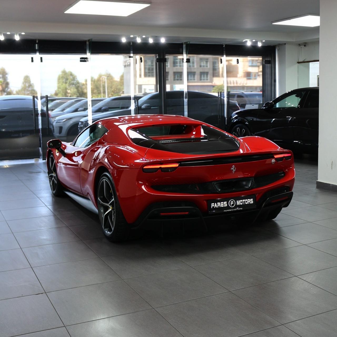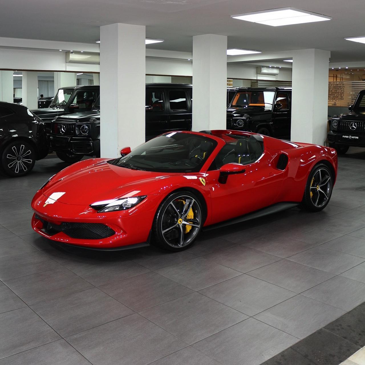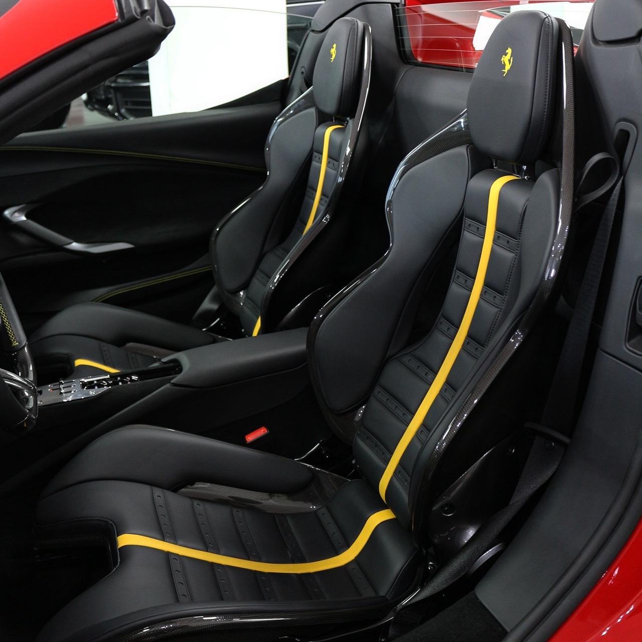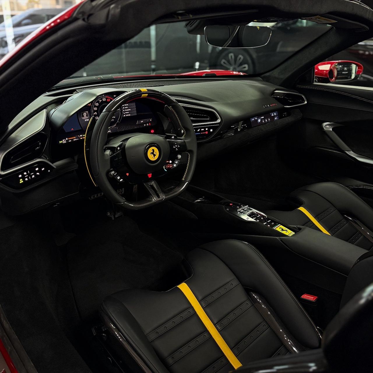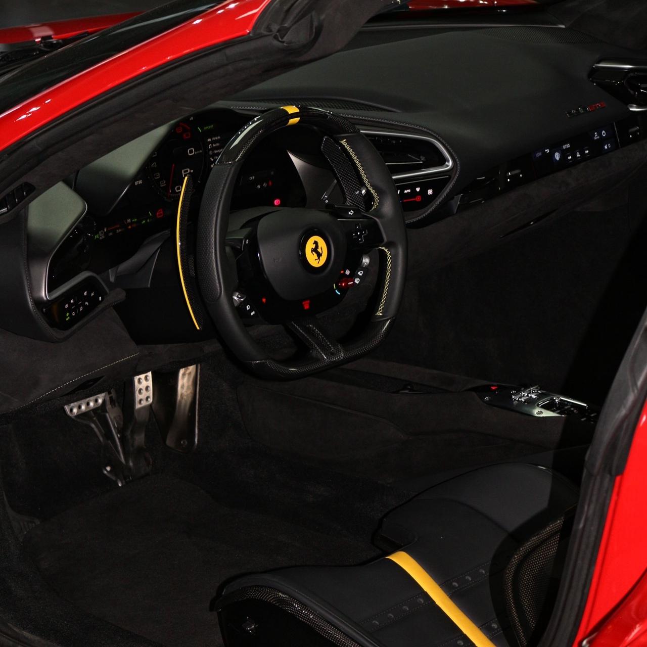 Brand new 2024 Ferrari 296 GTS in red with black & yellow carbon fiber interior, packing 819hp from its twin-turbo V6 hybrid for unmatched open-top performance and style.